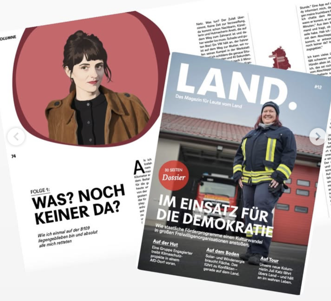 bin nicht nur riesiger fan vom LAND magazin, sondern darf ab dieser ausgabe sogar selbst mitgestalten – mit meiner eigenen kolumne über den ländlichen raum! sie heißt: „juli katz hält an“ und der name ist programm! 🏎️